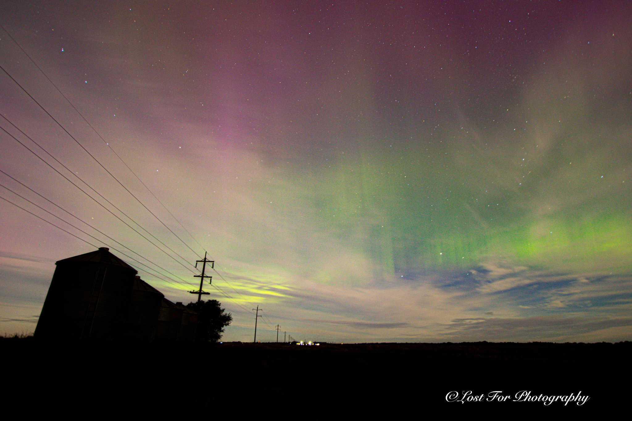 Now when I say this alert was different, it didn’t say there is a chance in the next hour. Oh no, this alert and word for word, said, “The KP Index is becoming very high and active. You should see Aurora’s in your location at around 8:54PM your time. Keep your eye to the sky for high Aurora activity.” This was a chance, a good chance. Hell it was a chance of seeing S.T.E.V.E. and I couldn’t risk not going out. Tripod and camera in my hand ready to go, dog in in tow, we were headed out. Now before I continue, it is important if your camera is not in a bag that to keep it safe, that you at least have a lens cap or filter on it to protect it. I say this because as I was headed to my car, my lovely dog who I dearly love very much, wrapped her leash around my legs causing me to wipe out on the pavement with my camera in my hand. Camera hit the ground but I think I absorbed the impact mostly as it was intact and not damaged. Just my pride as my neighbours saw it all happen. Anyways it didn’t deter me from going on. Winnie hops into the passenger seat, me in the driver seat and we were off to go pick up my mum who was coming along. We get to this location that we know about that is easy to manually focus on, take a few test shots and we waited. We waited and waited and about an hour goes by and nothing was happening. The Full Moon behind us, brightly lighting up the northern sky and as we were beginning to lose hope, I looked up and there she was. Miss Aurora herself making her appearance and in all her glory dancing above us. She was so strong you could see the pillars and detail with your naked eye as she moved towards the north, dancing with such grace. You could feel the spiritual connection, the life, the sound she would have made as she danced well into the night. I say well into the night cause I got 4 to 6 more notifications throughout the night until 6AM the next morning about her great activity. I am glad I went out, that I waited patiently, and got a chance to get these photos. Now the photo I am about to show you is taken in portrait style and I would not change it for the world. It just shows how greatly active she was and truly speaks to the wide open sky, the big prairies of the west, and how spiritual the connection is in every way. So I hope you enjoyed this story and I hope you enjoy my photos. You can view the rest in Gallery under the Landscapes album.