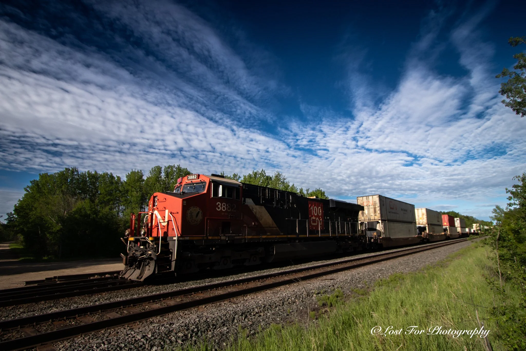 As a gift to my mum for her birthday, she wanted to do a roadtrip. We headed out west towards Hinton as there is a beautiful boardwalk that she had once visited there. Talked about before and ever since I wanted to go so I agreed to do this trip with her. We packed up my dog, our camera equipment, and by 7AM in the morning we were on the road to Hinton, Alberta. Stopping in Carvel, Alberta for a small breakfast and maybe get some photos of the sweet little General Store that is housed there. Unfortunately the store was roped off and didn’t make for the sight we had hoped for. It was not a complete loss though as we did manage to get 2 trains in passing of each other. One, when I went to photograph the tracks, was just coasting with the engine in idle. I didn’t even hear the rumble of it as it coasted to a stop, waiting for the light to turn so that he could continue on. This is a good note to know that you should always be track and train safe. As I approached the tracks, before I knew the train was there, I was going slow, looking to see what was there. When I turned, that is when I saw the train coming. I was still a very safe distance away but it is something to always keep in mind. The power of those trains, the sheer rumble as they start up, I won’t ever get tired of hearing. Thanks to the driver, he was the one who mentioned another train was coming and that we will be able to get a picture of the two of them passing each other.